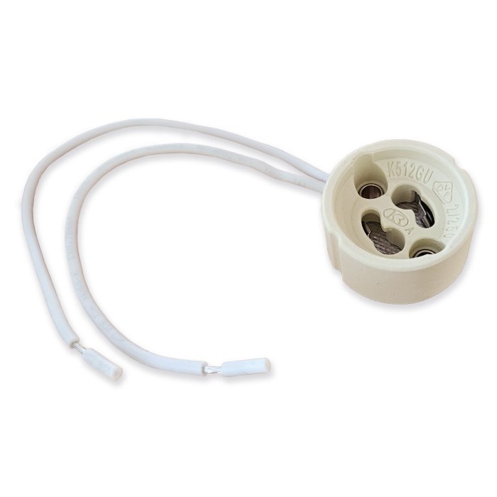 Objimka GU10 pre halogénové, alebo LED žiarovky. Dĺžka napájacieho vodiča 15 cm. Rozmery 28 x 15 mm. Keramická. Maximálne napätie 250V, prúd 2A.